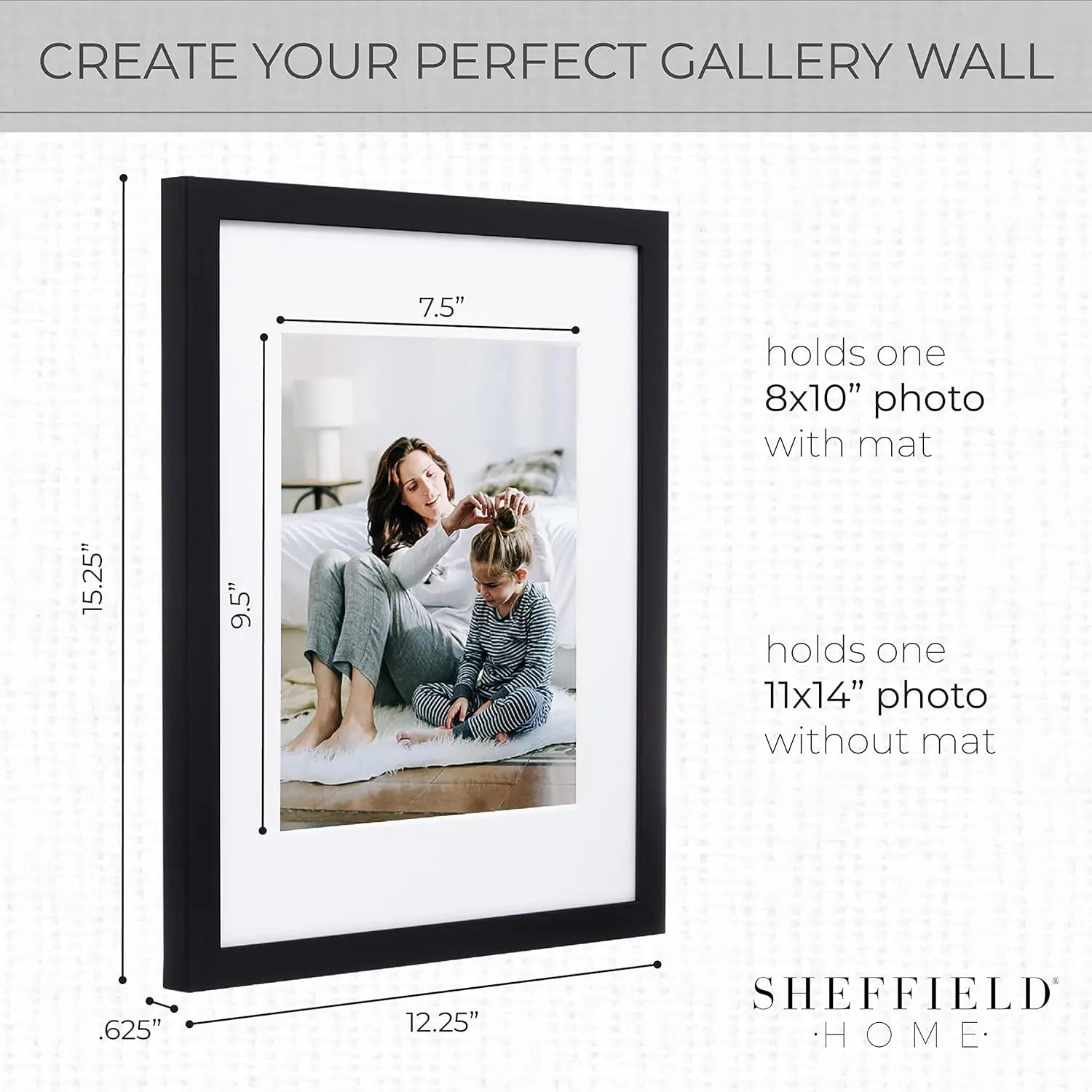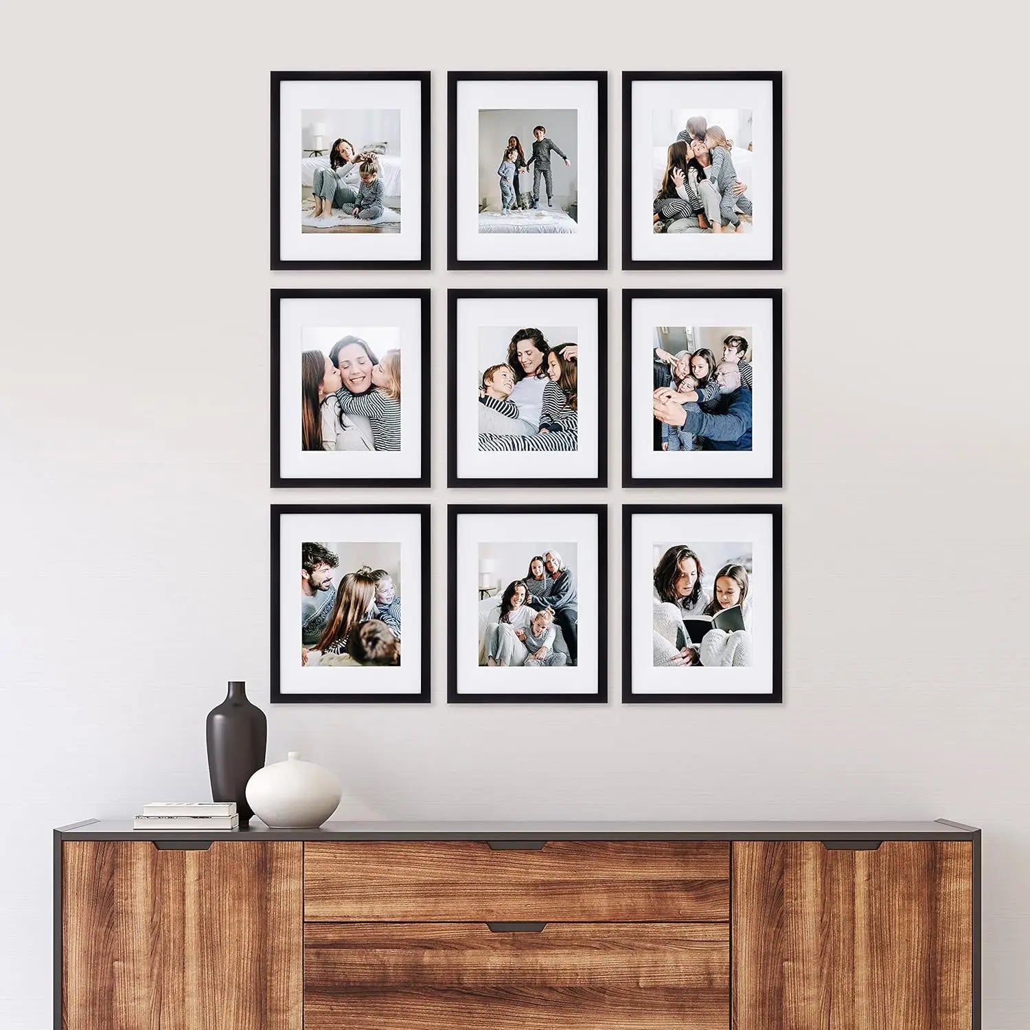 Transform your living space into a stunning gallery with this versatile 9-piece frame set! Perfect for showcasing your cherished memories, these frames are designed to display both 8x10 in. and 11x14 in. photos or art prints—simply use the included mat for smaller sizes or go frameless for larger ones. Crafted in a sleek matte black finish, they effortlessly blend with contemporary and modern home aesthetics, adding a touch of elegance to any room. Say goodbye to the hassle of measuring and aligning frames! Our easy-to-hang wall template offers multiple layout options, allowing you to create a professional-looking gallery wall in minutes. Just tape the template to your wall, hang each frame using the pre-attached hardware, and remove it once everything is perfectly placed. It's that simple—no tools or guesswork required! We believe every memory deserves to be displayed beautifully and preserved for years to come. That's why these frames are built with durable polystyrene construction, protective mats, and high-quality glass that wipes clean easily. They're not just frames; they're a timeless way to tell your story and cherish life's special moments. Whether you're decorating a cozy living room, brightening up a hallway, or adding personality to an office space, this set offers endless possibilities. Arrange all nine frames together for a striking gallery effect or scatter them throughout your home to highlight different photos and artworks. It's the perfect accessory for anyone looking to personalize their space—from busy families wanting to showcase vacation snapshots to art enthusiasts curating their own mini-exhibits. Imagine walking into a room filled with your favorite memories every day... Picture how these elegant frames will complement your decor and spark conversations with guests... Don't wait any longer—bring warmth and style into your home today! Click 'Add to Cart' now and start creating the gallery wall of your dreams.